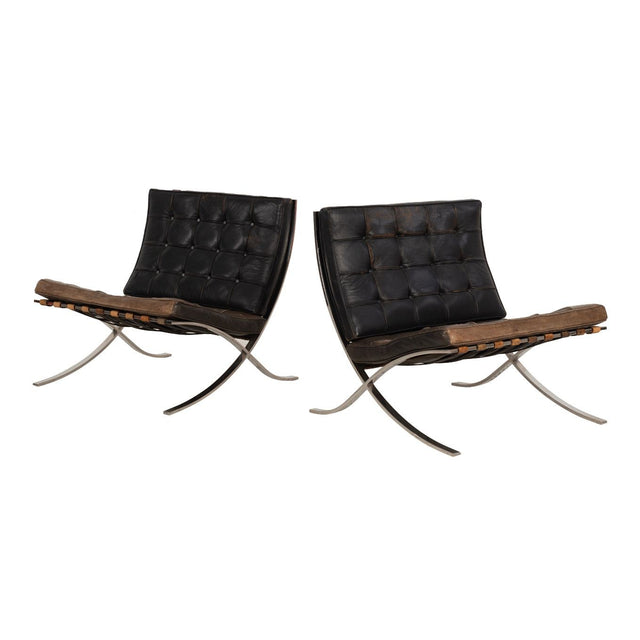 A rare early production pair of Barcelona Chairs with matching ottoman, crafted circa 1960 by G.R. Griffith under the direct supervision of Mies van der Rohe. These pre-Knoll examples are distinguished by their precisely finished corners and a more minimal central cross reinforcement—hallmarks of Griffith's workshop quality.