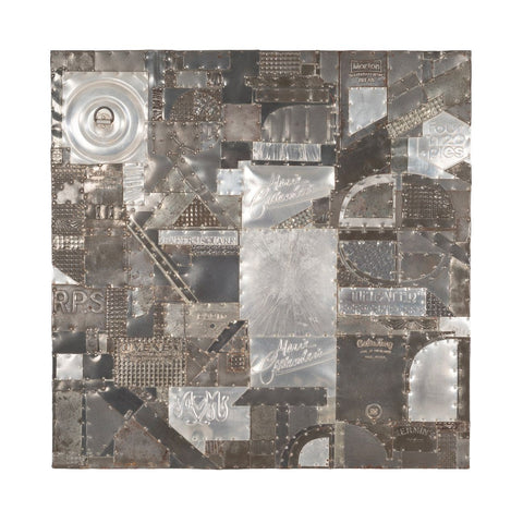 Max Neufeldt Aluminum Collage – Assemblage Sculpture, 1985A compelling example of Max Neufeldt’s "Tin Quilting" mature assemblage style, this 1985 aluminum collage marries industrial metal with warm wood in a poetic, wall-mounted composition. Found cake and pie pans are meticulously nailed to a solid wooden panel, creating a rhythmic interplay of reflected light and textured surfaces. Signed on the reverse “#392 Neufeldt Santa Barbara,” this piece captures the artist’s ability to transform everyday objects into evocative sculptural narratives.