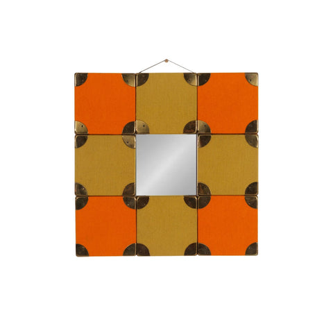 This is the "Mirror for Textiles & Objects" designed by Alexander Girard for Herman Miller in 1961. The mirror was created for Girard's avant-garde "Textiles and Objects Shop" that opened in New York City in 1961. It features a mirrored glass center surrounded by panels of fabric-covered wood with brass corner details. The design reflects Girard's approach of combining vibrant colors and folk influences with functional modernism.
