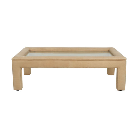 Richly inspired by the luxe, architectural designs of Karl Springer, this coffee table combines sumptuous upholstery with gleaming metal and glass accents.